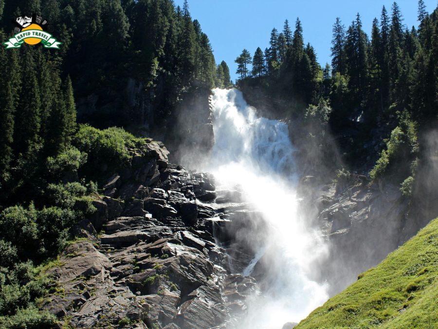 | Wodospady Krimml | Zespół trzech kaskadowych wodospadów położonych w regionie Parku Narodowego Wysokich Taurów w Austrii. Łączna wysokość spadku wody wynosi około 380 metrów, co czyni je najwyższymi wodospadami w Europie. Obszar wokół wodospadów jest objęty ochroną przyrodniczą i przystosowany do ruchu turystycznego dzięki ścieżkom i platformom widokowym. Podczas wizyty uczestnicy poruszają się wyznaczoną trasą spacerową wzdłuż kaskad. |