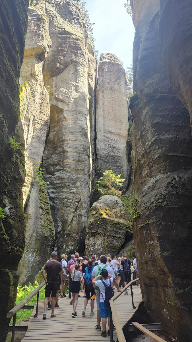 Po śniadaniu wyjedziemy z Pragi i udamy się w stronę Skalnego Miasta w Adršpachu. to miejsce od pierwszych minut robi wrażenie – zamiast klasycznego krajobrazu zobaczymy skalny labirynt, w którym pionowe ściany wyrastają nagle z ziemi, tworząc wąskie przejścia, wysokie korytarze i naturalne „ulice” między skałami.