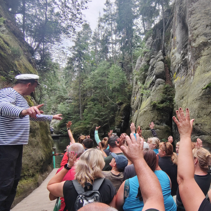 Dotrzemy także do skalnego jeziora, ukrytego pomiędzy wysokimi ścianami. To właśnie tutaj czeka nas jeden z najbardziej klimatycznych momentów całego wyjazdu – rejs łódką. Przepłyniemy spokojnie przez wąski akwen, a przewodnik – w charakterystyczny, lekko humorystyczny sposób – będzie opowiadał historie, legendy i ciekawostki związane z tym miejscem. To nie jest typowy „suchy komentarz”, tylko element, który tworzy atmosferę i sprawia, że to doświadczenie zostaje w pamięci.
