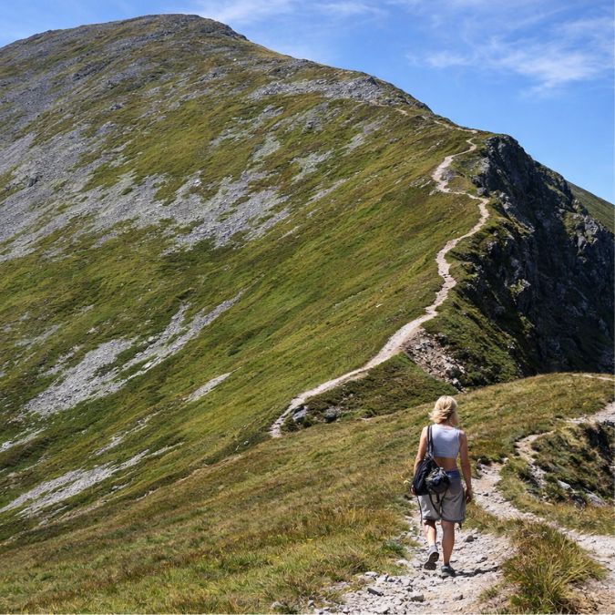 Najmocniejszym momentem będzie przejście granią – kilka szczytów jeden po drugim, z widokami ciągnącymi się daleko po obu stronach i poczuciem prawdziwej górskiej „roboty” w nogach.